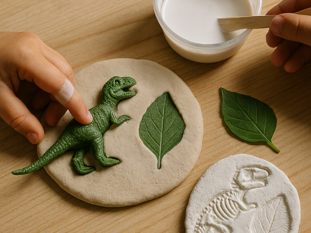 葉っぱや恐竜模型を使って、化石ができる仕組みを楽しく学ぼう!自分だけの化石づくりに挑戦できるワクワク体験ブース!