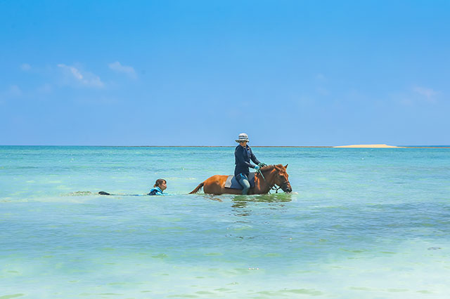 海の中で馬に乗ったり、しっぽにつかまって泳いだりする珍しい遊びが楽しめます。(*身長130cm以上)