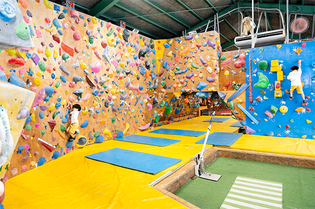 5メートルほどの天井までボルダリングウォールでびっしりと囲まれた広い施設内。カラフルで大小さまざまなホールドを一つひとつ手作業で取り付けて作ったのだそう!初心者やお子さん向けのコースもあるので、親子で体験するのにもってこいの施設です。