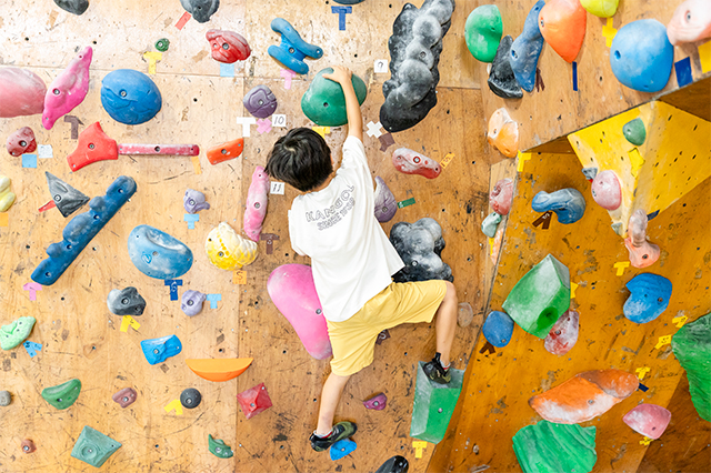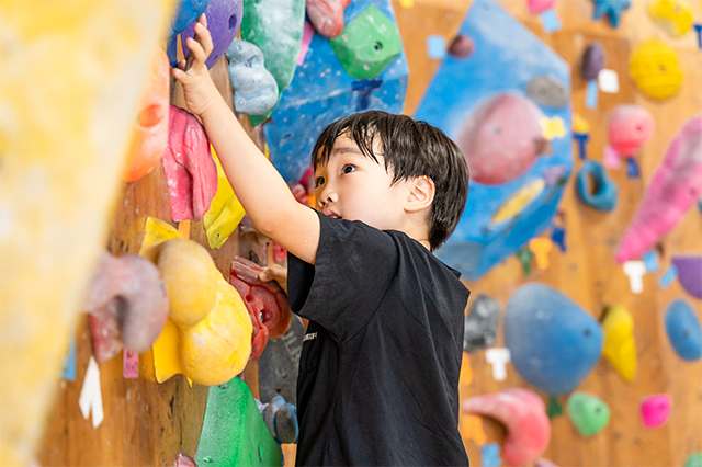 スタート地点から、天井付近のゴールを目指して登っていくボルダリング。筋力や柔軟性など基礎的な運動能力はもちろん、失敗しても諦めない気持ちや、自力で解決策を見出す力などを楽しみながら身に着けることができます。