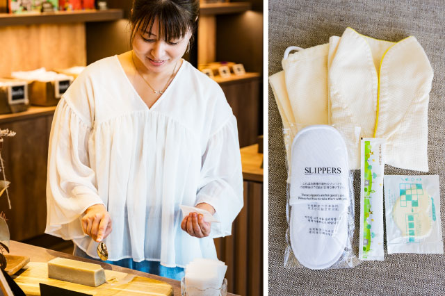 ホテルオリジナルの香り「やんばるグリーン」のバスソルトや、月桃とクチャの石けんなど、バスタイムが楽しみになるアイテムにママのテンションもUP♪ 必要なものだけを選ぶ、環境にやさしい取り組みです。