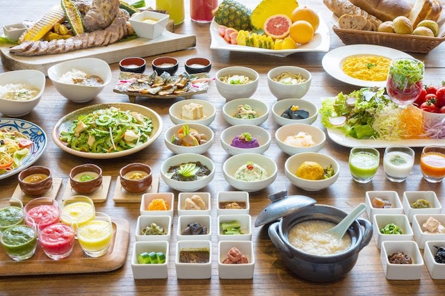 朝食ビュッフェでは、消化にやさしい「発酵ごはん」を中心に、生産者の顔が見える安心食材を使用。海藻や島野菜を使った伝統料理、発酵ドレッシングと国産野菜のサラダバー、季節野菜の自家製スムージーなど、野菜をたっぷり楽しめます。