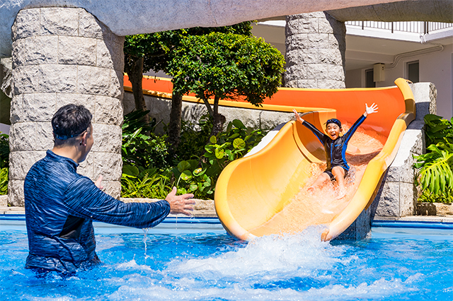 全長170メートルを誇るプールは6つのエリアに分かれ、全長47.5メートルのウォータースライダー※や、深さ60センチのキッズプールと幼児用滑り台、季節に合わせて適温に調整されるホットプールも備えています。