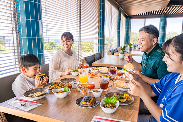洋食をはじめ、和食、沖縄料理、中国料理やバーベキューなど多彩な“クワッチー(ごちそう)”が味わえるカジュアルレストラン。窓の向こうに水平線が広がり、明るく開放的な空間で食事が楽しめます。