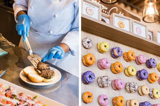 地元やんばる産の旬の食材を使ったメニューや、ジャングリア沖縄の開園を記念した期間限定メニューも。カラフルなドーナッツが並ぶドーナッツウォールには、みんなの目が釘付けになっていました。