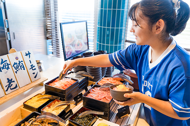 自分で作れるセルフメニューの「海鮮のっけ放題丼」に挑戦!好きな具材を好きなだけのせて、“夢の海鮮丼”が完成です。ほかにもその場であぶったのりとお好みのトッピングを加えて作る「ポーク玉子おにぎり」もあり、どちらも大人気です。
