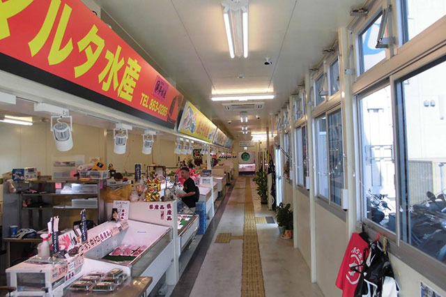2023年にオープンした「なはまぐろ市場」。1階には7店舗の鮮魚店が並び、活気ある市場の雰囲気を楽しめます。2階にはイートインスペースにテラス席、赤ちゃんスペースや展示室が備わり、家族連れでも安心して利用できる市場です。
