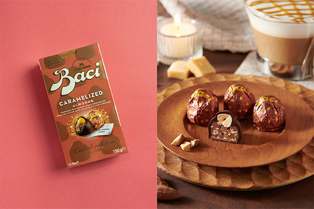 イタリアの老舗チョコレートブランド「Baci(バッチ)」。イタリアでは、家族や恋人、友人など大切な人への贈り物として親しまれている定番チョコレートです。この冬は、限定フレーバーのキャラメルアーモンド味が登場。細かく刻んだヘーゼルナッツと、キャラメリゼしたアーモンドチップを合わせたジャンドゥーヤは、香ばしさとコクのバランスが絶妙です。