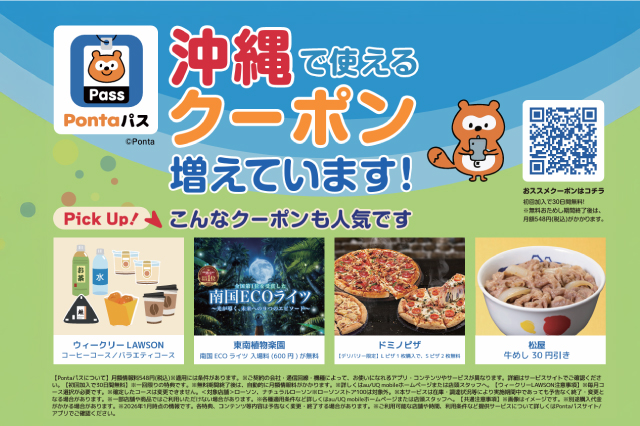 沖縄県内で使える、おトクがさらに広がる「Pontaパス」。月額548円で、買い物からお食事、週末のおでかけまで幅広く活用できるクーポンが利用可能です。県内企業とのコラボクーポンに加え、ローソンの人気商品が割引になる「ウィークリーローソン」クーポンも毎週配信。使えば使うほどお得なサービスです。