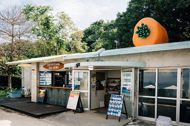 マリンアクティビティや食事が楽しめる「津堅島シークルーズ」へ。事前に予約しておくと、港まで送迎バスでお迎えに来てくれます。