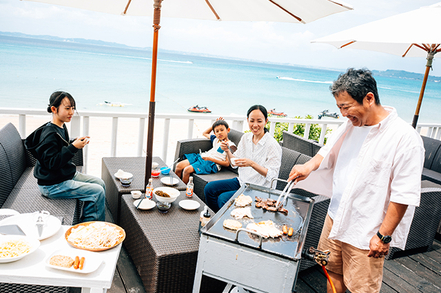 海でたっぷり遊んだ後は、お楽しみのランチタイム。オーシャンビューの開放的なテラス席で、特製BBQメニューをいただきます。