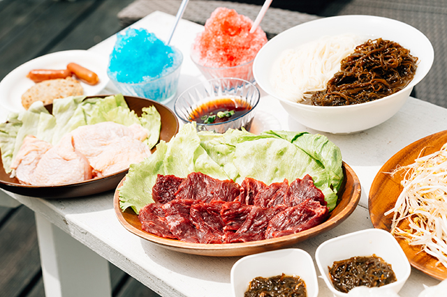 津堅島産のもずくをはじめ、冷やしそうめん(or焼きそば)、野菜の盛り合わせ、おにぎり、かき氷まで付いた充実の内容で、満足感たっぷりのおいしさです。キッズメニューはハンバーグとウインナー付き!