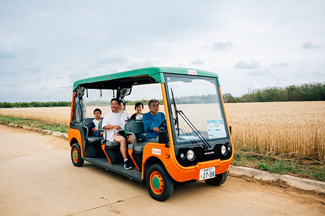島内にはレンタカーがないため、移動はにんじんカラーがかわいい乗合・貸切タクシー「キャロタク」で。風を感じながら、のどかな島の風景を楽しめます。